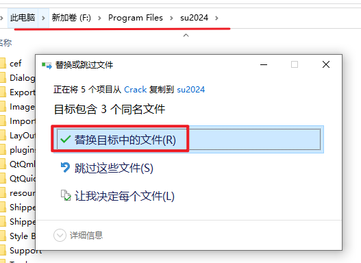 8.粘贴复制的文件到软件安装路径下,选择“替换目标中的文件”