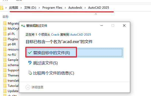 10.粘贴到软件安装路径,选择“替换目标中的文件”