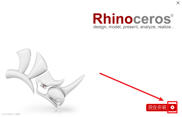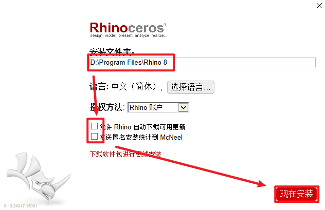 4.选择软件安装路径,安装路径不要出现中文,取消勾选“允许Rhino自动下载可用更新”和“发送匿名安装统计…”,点击“现在安装”