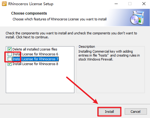 8.取消勾选“Rhinoceros 7和Rhinoceros 6”两项,点击“Install”