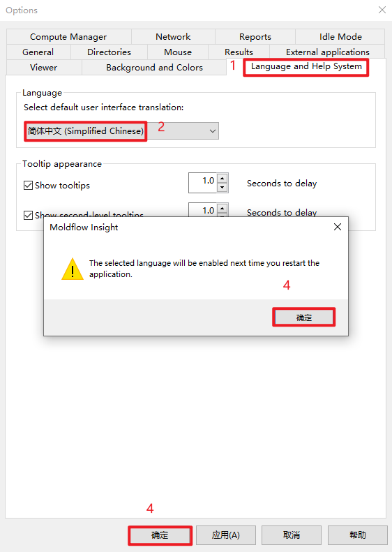 16.点击【Language…】选择【简体中文】,点击确定,然后点击【确定】后重启软件。