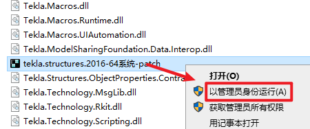 26.选中复制粘贴过来的“tekla.structures.2016-64系统-patch.exe”可执行文件,鼠标右键选择“以管理员身份运行”