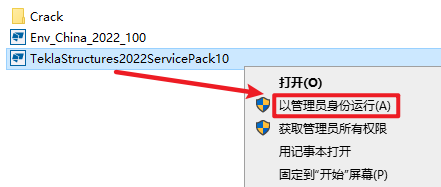 2.打开解压好的文件夹,选中“TeklaStructures2022ServicePack10”右键选择“以管理员身份运行”