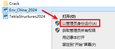 12.返回安装文件夹“Tekla Structures 2024 SP0”,选中“Env_China_2024”,右键选择“以管理员身份运行”