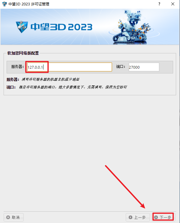 10.在服务器填写:127.0.0.1,点击“下一步”