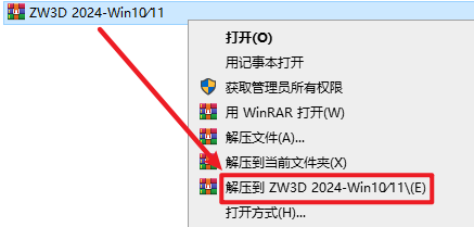1.选中下载的安装包,右键选择解压到“ZW3D 2024-Win10∕11”