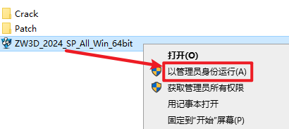 2.打开解压好的文件夹,选中“ZW3D_2024_SP_All_Win_64bit”,右键选择“以管理员身份运行”