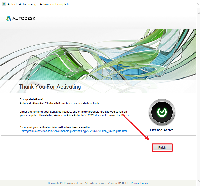 18.出现提示“Autodesk Alias AutoStudio 2020 has been successfully activated.”,说明激活成功,点击“Finish”