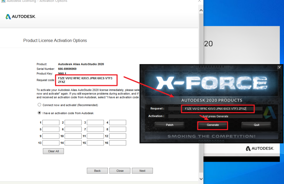 16.将安装界面的“Request code申请码”复制到粘贴到“Request”,点击“Generate”