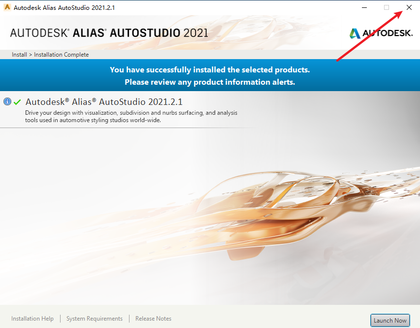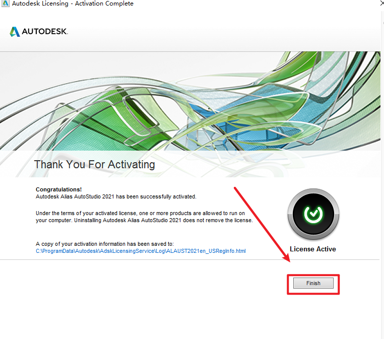19.出现提示“Autodesk Alias AutoStudio 2020 has been successfully activated.”,说明激活成功,点击“Finish”