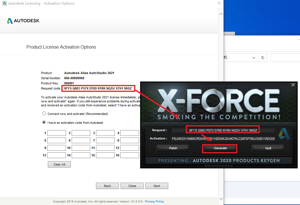 16.将安装界面的“Request code申请码”复制到粘贴到“Request”,点击“Generate”,