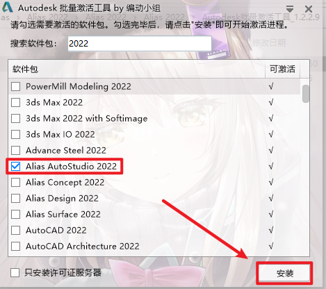 11.找到并勾选“Alias AutoStudio 2022”软件,点击“安装”