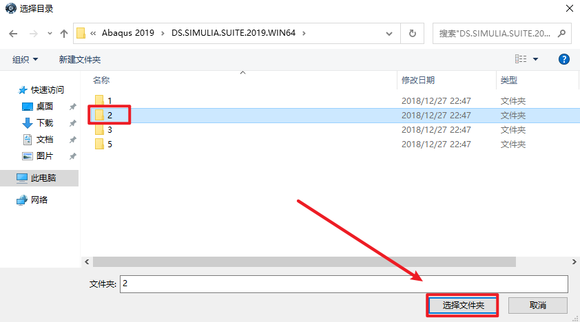 26.选择安装包中“DS.SIMULIA.Suite.2019.Win64“文件夹下的“2“文件夹,点击“选择文件夹“