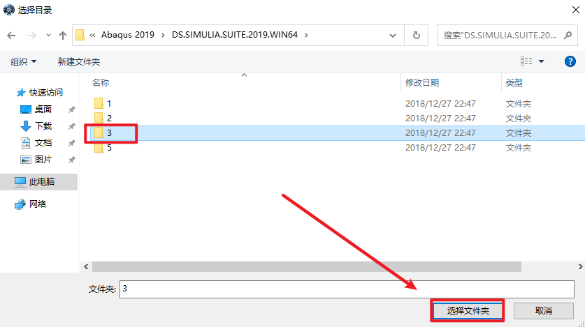 53.选择安装包中“DS.SIMULIA.Suite.2019.Win64“文件夹下的“3“文件夹,点击“选择文件夹“