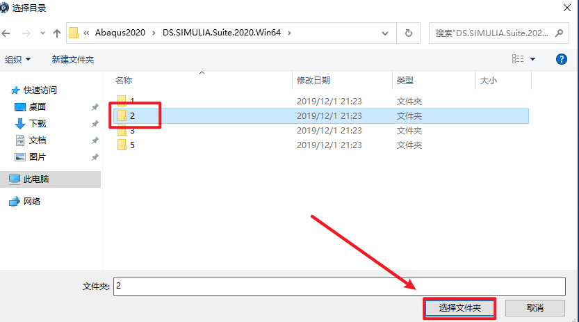 16.选择安装包“DS.SIMULIA.Suite.2020.Win64“文件夹下的“2“文件夹,点击“选择文件夹“