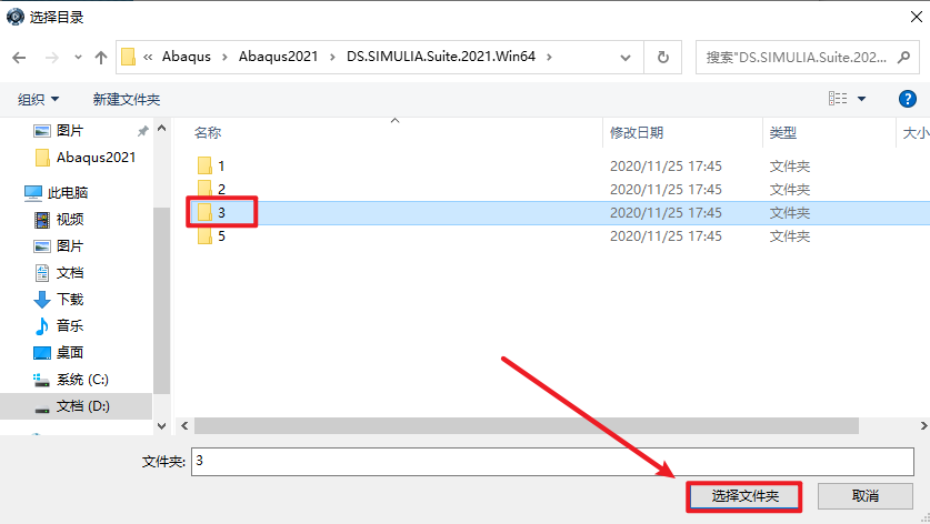 30.选择安装包“DS.SIMULIA.Suite.2021.Win64“文件夹下的“3“文件夹,点击“选择文件夹“