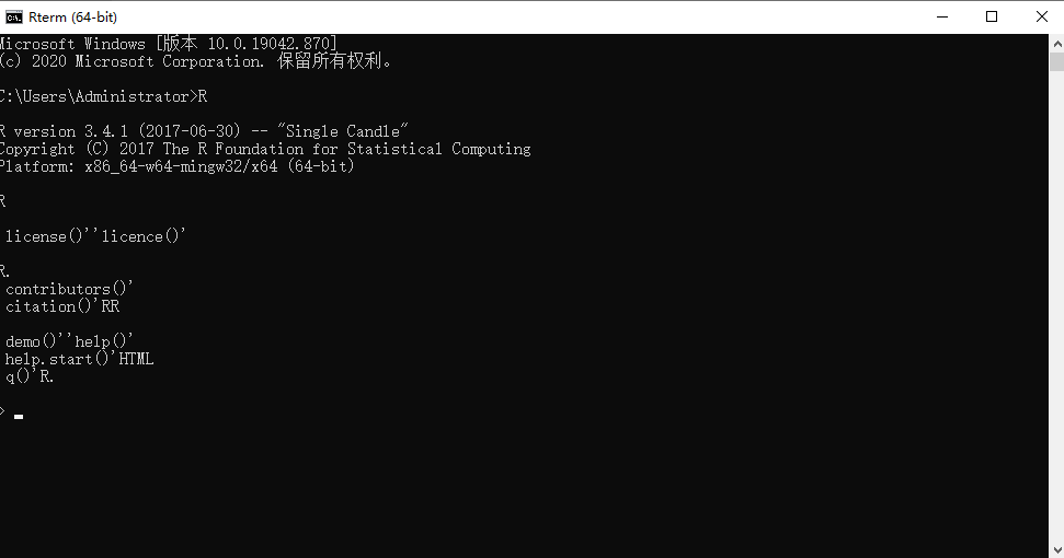 23.输入:R,点击回车(Enter)键,查看R是否安装成功和环境配置成功与否