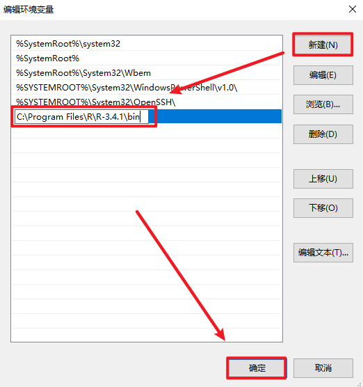 19.点击“新建”,输入:C:\Program Files\R\R-3.4.1\bin(参看第5步),点击“确定”