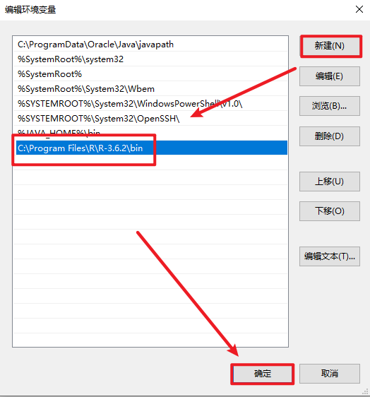 18.点击“新建”,输入:C:\Program Files\R\R-3.6.2\bin(参看第5步),点击“确定”