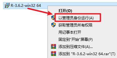 2.打开刚刚解压的文件夹,找到并选中“R-3.6.2-win32 64”右键选择“以管理员身份运行”
