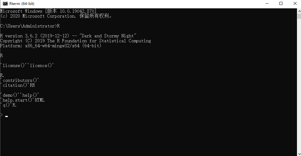 22.输入:R,点击回车(Enter)键,查看R是否安装成功和环境配置成功与否