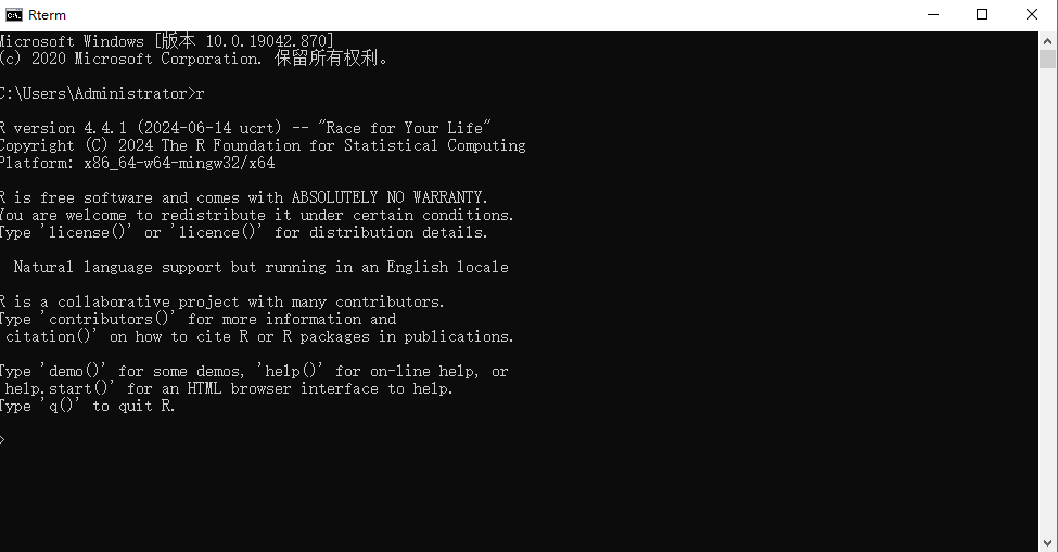 22.输入:R,按回车键,查看R是否安装成功和环境配置成功与否