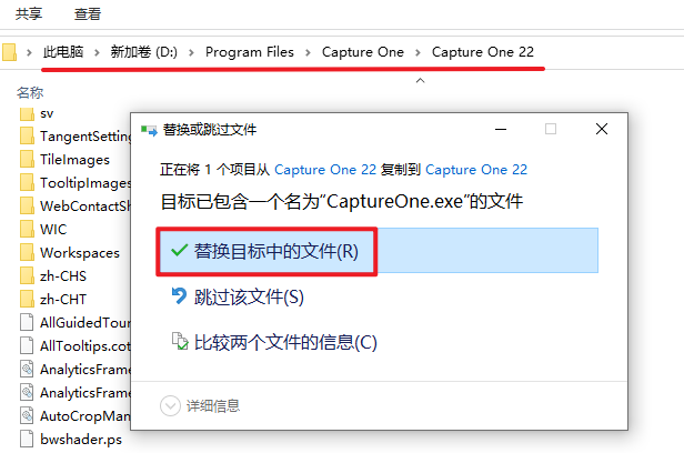 15.粘贴复制的文件到该路径下,选择“替换目标中的文件”