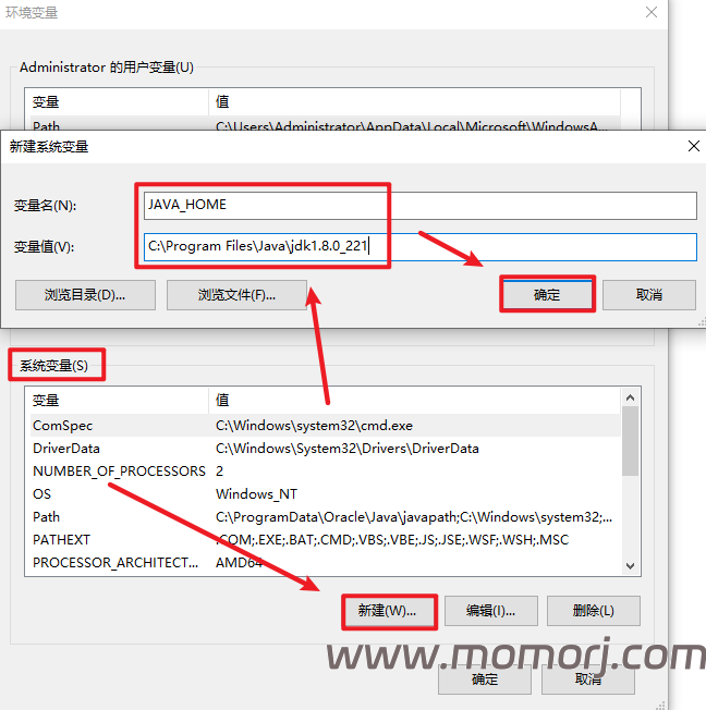 温馨提示:这个变量值就是JDK的安装路径(参看第4步),如果是32位的JDK则输入”C:\Program Files (x86)\Java\jdk1.8.0_221”