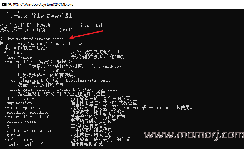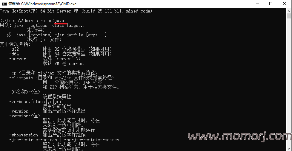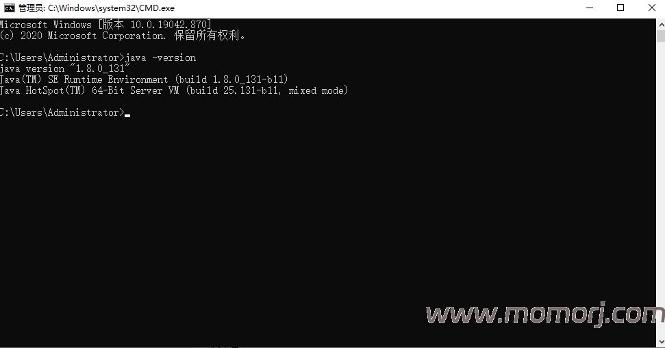 19.输入“java -version“(java 和 -version 之间有空格),点击回车键,可以看见自己安装的JDK版本