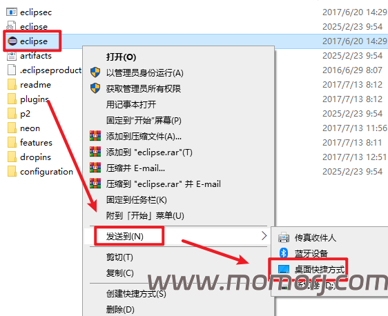 22.返回安装”文件夹,双击打开“eclipseeclipse”文件夹,选中“eclipse“文件,右键选择“发送到—桌面快捷方式”