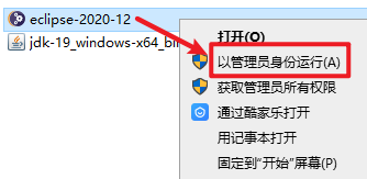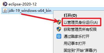 2.打开刚刚解压的文件夹,选中“jdk-19_windows-x64_bin”右键选择“以管理员身份运行”
