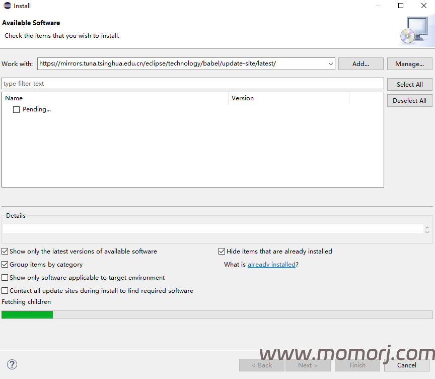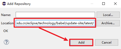 “https://mirrors.tuna.tsinghua.edu.cn/eclipse/technology/babel/update-site/latest/”(原本的内容需删除),点击“Add”