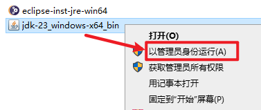2.打开刚刚解压的文件夹,选中“jdk-23_windows-x64_bin”右键选择“以管理员身份运行”