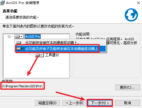 10.点击倒三角展开符,选择“此功能及所有子功能将安装到本地硬盘驱动器上“,选择软件安装路径,安装路径不要出现中文,点击“下一步”