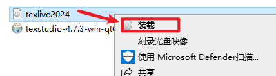 2.打开刚刚解压的文件夹,找到并选中“texlive2023.iso”文件,右键选择“装载”(如果没有“装载”选项的可以右键选择“打开方式—Windows资源管理器”打开)