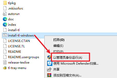 3.在打开的文件夹,找到并选中“install-tl-windows.bat”,右键选择“以管理员身份运行”