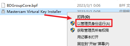 10.返回安装文件夹,依次打开“激活工具–Mastercam通用许可证驱动“文件夹,找到并选中“Mastercam Virtural Key Installer”,右键选择“以管理员身份运行”