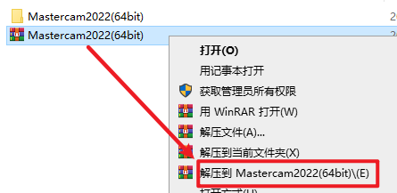 1.选中下载的压缩包,然后右键选择解压到”Mastercam2022(64bit)”