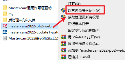 2.打开刚刚解压的文件夹,找到并选中“mastercam2022-web”,右键选择“以管理员身份运行”