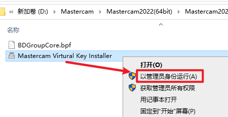 11.返回安装文件夹,打开“Mastercam通用许可证驱动“文件夹,找到并选中“Mastercam Virtural Key Installer”,右键选择“以管理员身份运行”