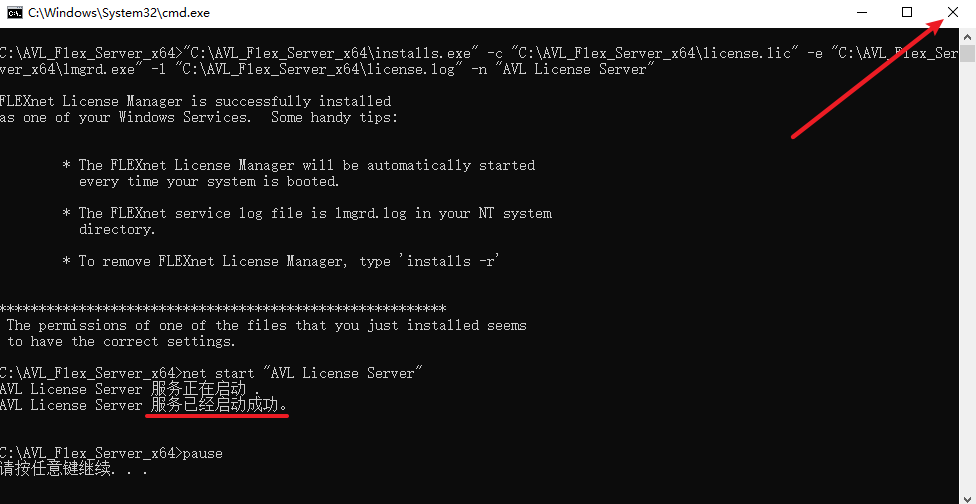 5.提示”AVL License Server 服务己经启动成功”后,点击右上角关闭