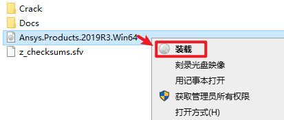 2.打开刚刚解压的文件夹,选中“Ansys.Products.2019R1.Win64”iso文件,右键选择“装载”(如果没有“装载”选项的可以右键选择“打开方式—Windows资源管理器”打开,Windows7系统鼠标右键解压即可)