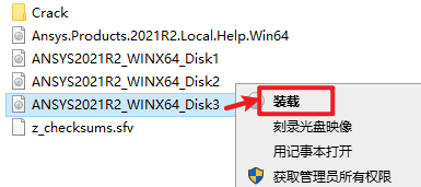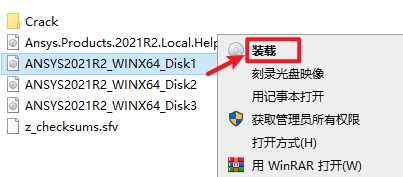 2.打开刚刚解压的文件夹,选中“ANSYS2021R2_WINX64_Disk1”iso文件,鼠标右键选择“装载”(如果没有“装载”选项的可以右键选择“打开方式—Windows资源管理器”打开)