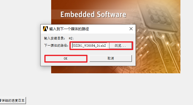 11.当安装进度达到40%的时候,点击“浏览”选择安装包解压后的“ANSYS2022.R1(64bit)”文件夹里面的“ANSYS2022R1_WINX64_Disk2”文件夹,点击“选择文件夹”,点击“OK”,软件继续安装