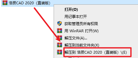 1.选中下载的压缩包,然后右键选择解压到“浩辰CAD2020(直装版)