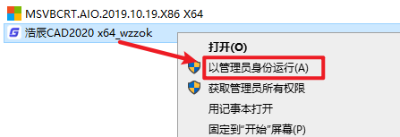 2.打开刚刚解压的文件夹,选中“浩辰CAD2020 x64_wzzok”右键选择“以管理员身份运行”