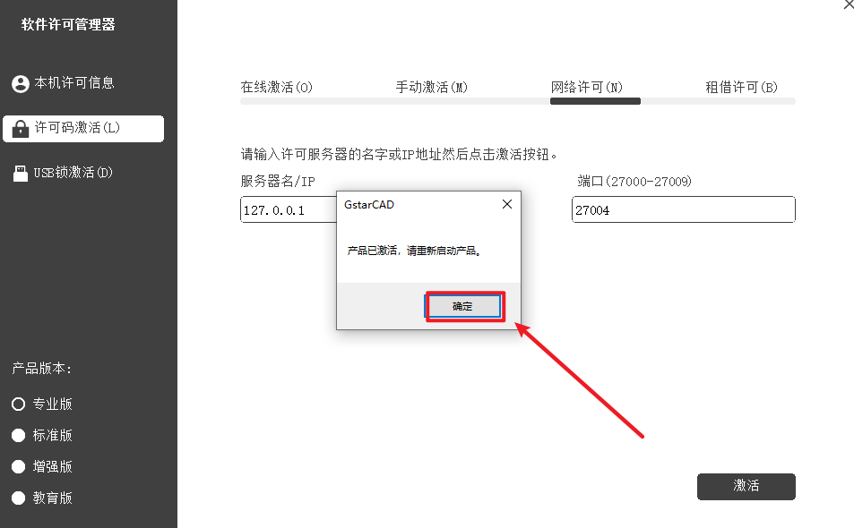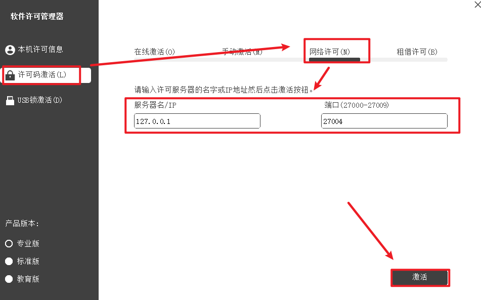 17.点击“许可码激活”-“网络许可”,服务器名输入:127.0.0.1,端口输入:27004,点击“激活”