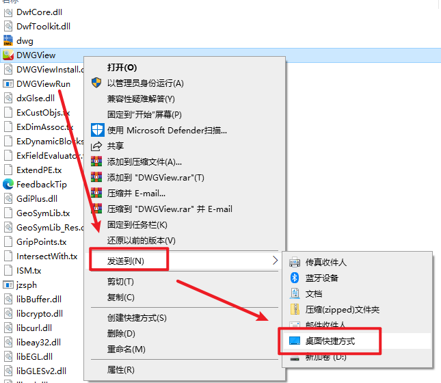 2.打开刚刚解压的文件夹,找到并选中“DWGView.exe”右键选择“发送到”,点击“桌面快捷方式“