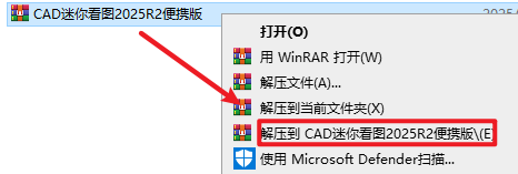 1.选中下载的压缩包,然后右键选择解压到“CAD迷你看图2025R2便携版”