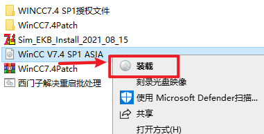 3.选中“WinCC_V7.4SP1ASIA”文件,右键选择“装载”(如果没有“装载”选项的可以右键选择“打开方式—Windows资源管理器”打开,win7系统请右键解压文件)